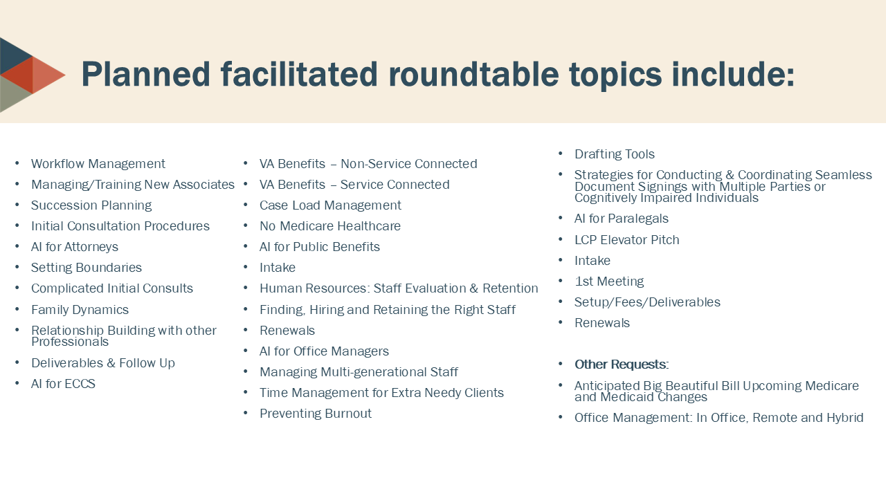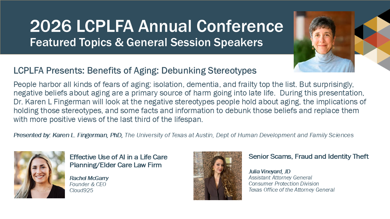 This event promises to be a remarkable opportunity for networking, professional development, and sharing innovative ideas within our community. With registration fees set at $599 for LCPLFA members and $799 for non-members, we encourage all elder care law professionals to seize this chance to invest in their growth and connect with like-minded individuals.